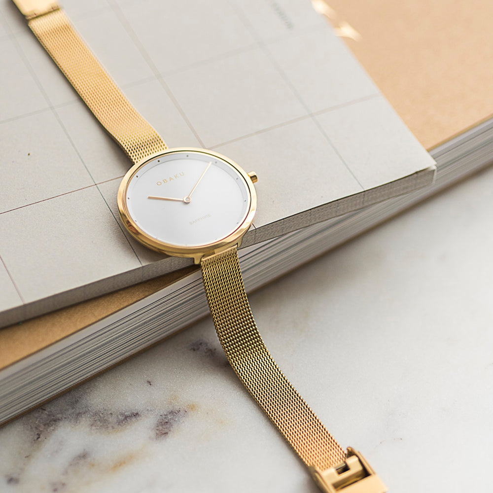 The golden color of this outstanding Obaku watch expresses warmth, love and compassion. No matter whether you use it to spice up your casual jeans or wear them with your favorite clothes. This minimalist masterpiece comes with a gold-plated case that features a stunning white dial and a gold stainless steel mesh bracelet. Pure Scandinavian design principles are at the heart of all Obaku designs that were created to look as modern in 10 years as they do today. The name of the Danish designer of this watch Christian Mikkelsen, who is known for his high level of perfection, is engraved on the back of the case. Feel the moment!
