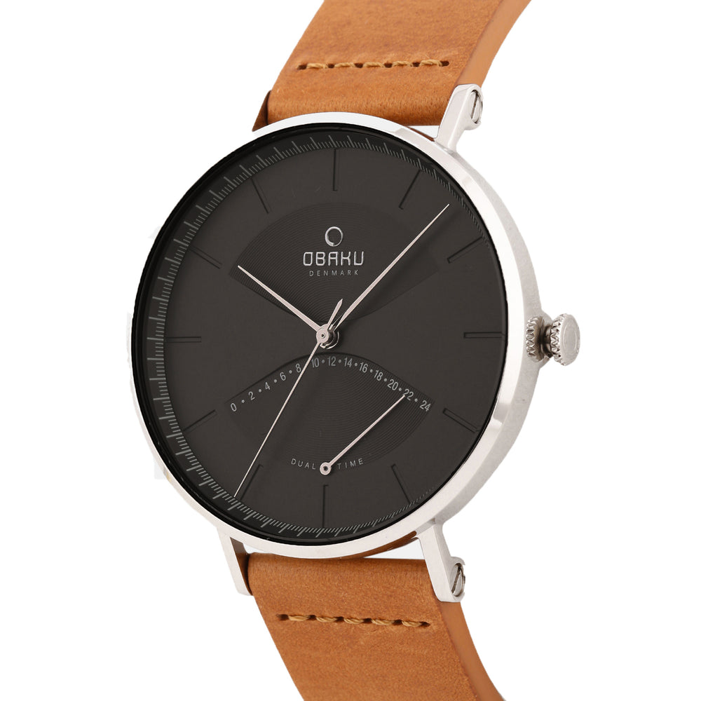 Compel the onlookers to cast a glance of appreciation as you wear this men's analog watch from OBAKU's Elm Camel collection. Secured by a scratch-resistant glass, the black round dial exhibits plain three hands, stick markings, a date display, dual time and a crown for time adjustment. The tan genuine leather strap along with a buckle clasp ensures a secure fit on the wrist. This water-resistant watch can be teamed with a pair of denims and a polo T-shirt to make a style statement.